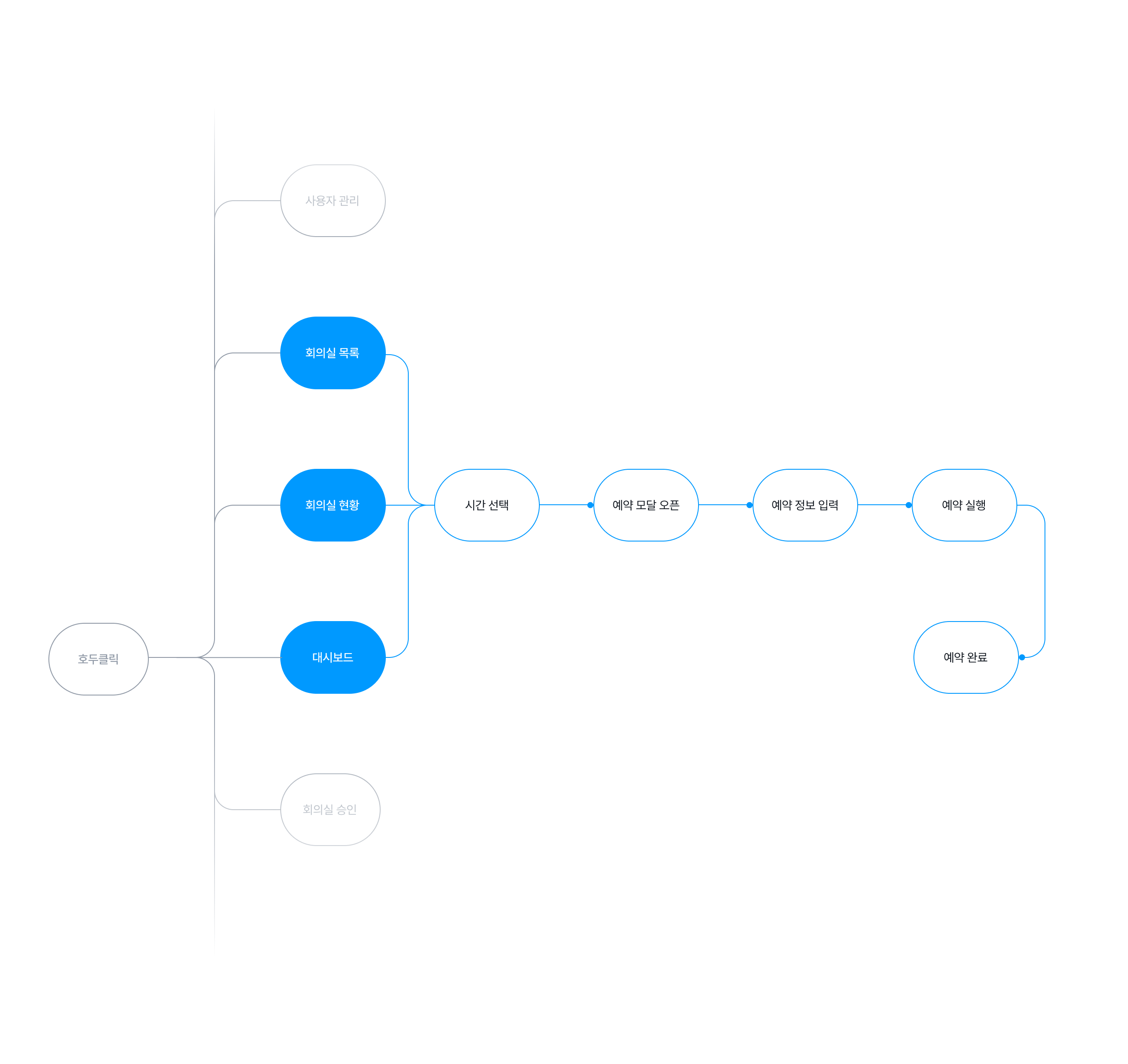 모바일 환경에서 개인이 회의실을 예약하는 방식으로 설계된 서비스를, 수많은 회의실과 인원을 실시간으로 조율해야 하는 관리자용 웹 환경으로 확장했습니다. 사용 주체와 환경이 달라진 만큼, 단순히 화면을 키우는 것이 아닌 관리자의 업무 흐름에 맞는 새로운 구조가 필요했습니다.