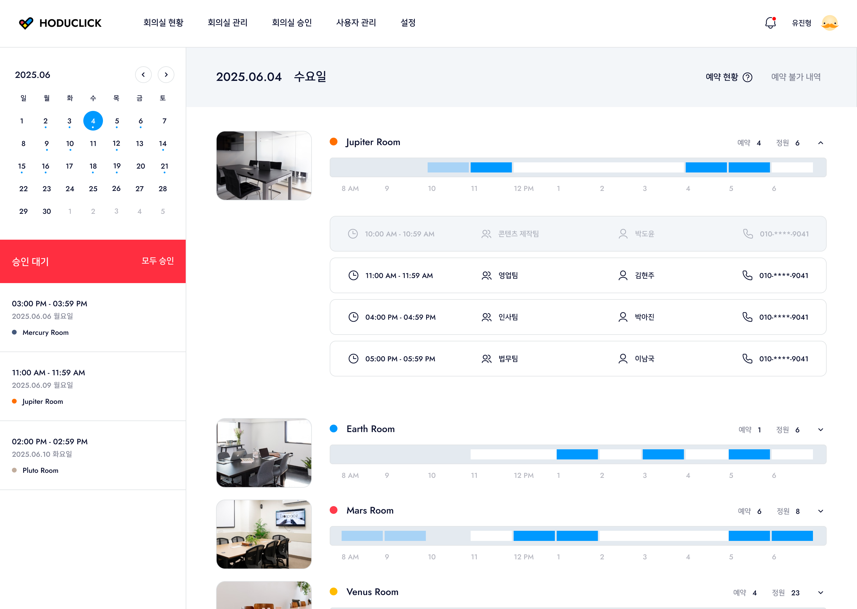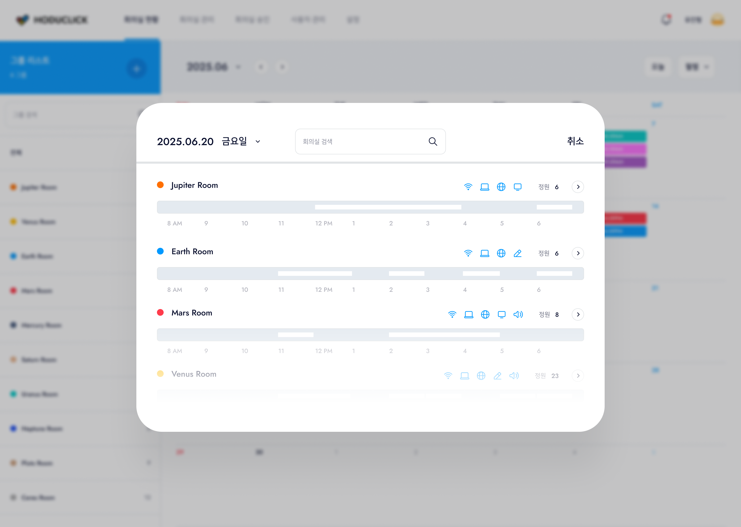 사용자가 예약 가능한 회의실을 확인하고, 모달을 통해 정보를 입력한 뒤, 최종 승인(Confirm) 단계까지 이르는 모든 과정을 단일 화면 내 인터랙션으로 유기적으로 통합했습니다. 불필요한 페이지 이동을 제거하여, 탐색과 예약 관리가 끊김 없이 이어지는 최적의 동선을 구축했습니다.
