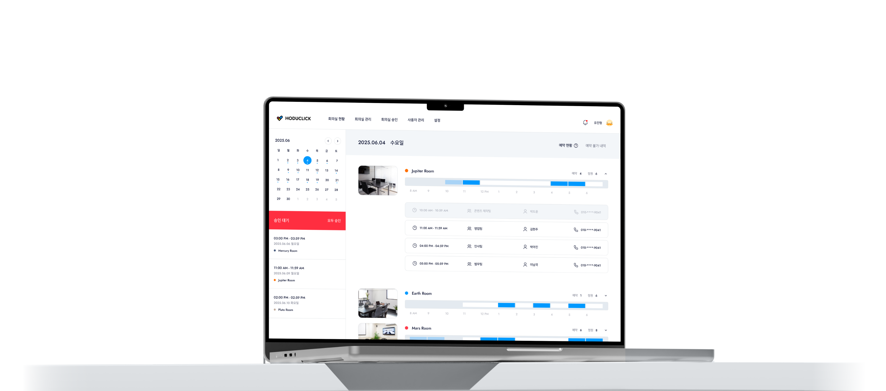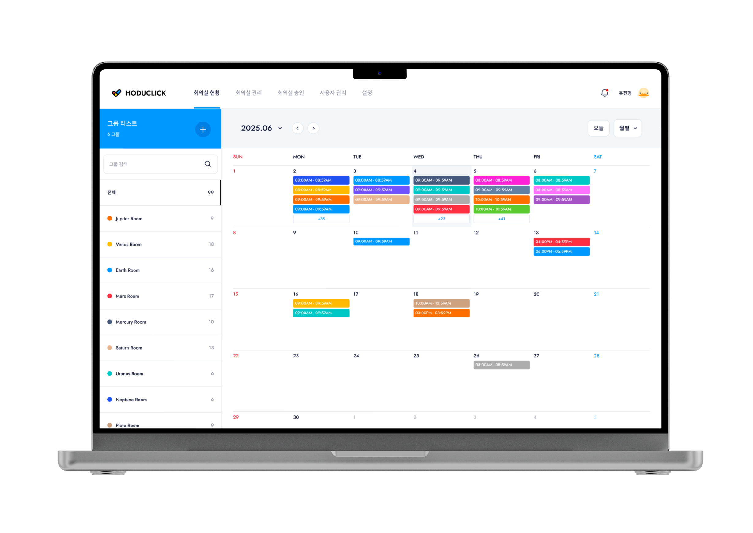 기존에 운영 중인 회의실 예약 앱의 디자인 시스템을 계승하여, 중대형 오피스 환경에 최적화된 웹과 태블릿 버전을 새롭게 구축한 프로젝트입니다. 사내의 수많은 회의실 현황을 실시간으로 파악하고 예약 및 취소를 신속하게 처리할 수 있도록 설계되었으며, 대규모 조직의 사용자가 데스크톱과 현장(회의실 입구)에서 모두 일관된 브랜드 경험을 누릴 수 있도록 개발되었습니다.