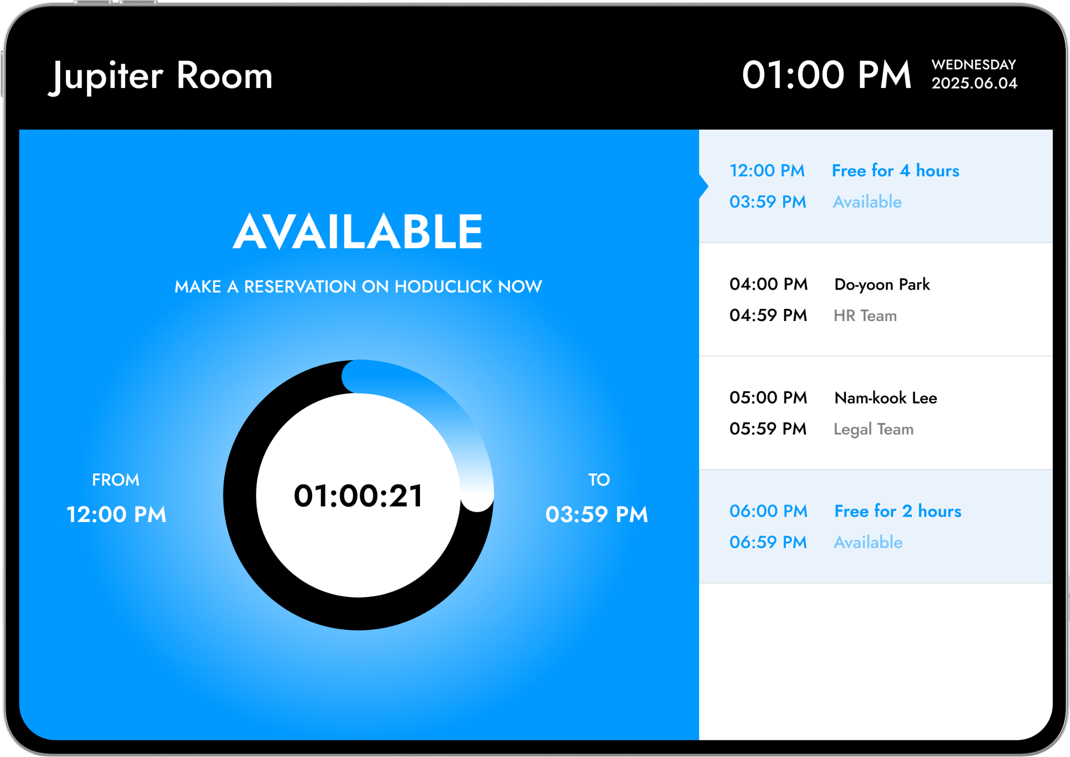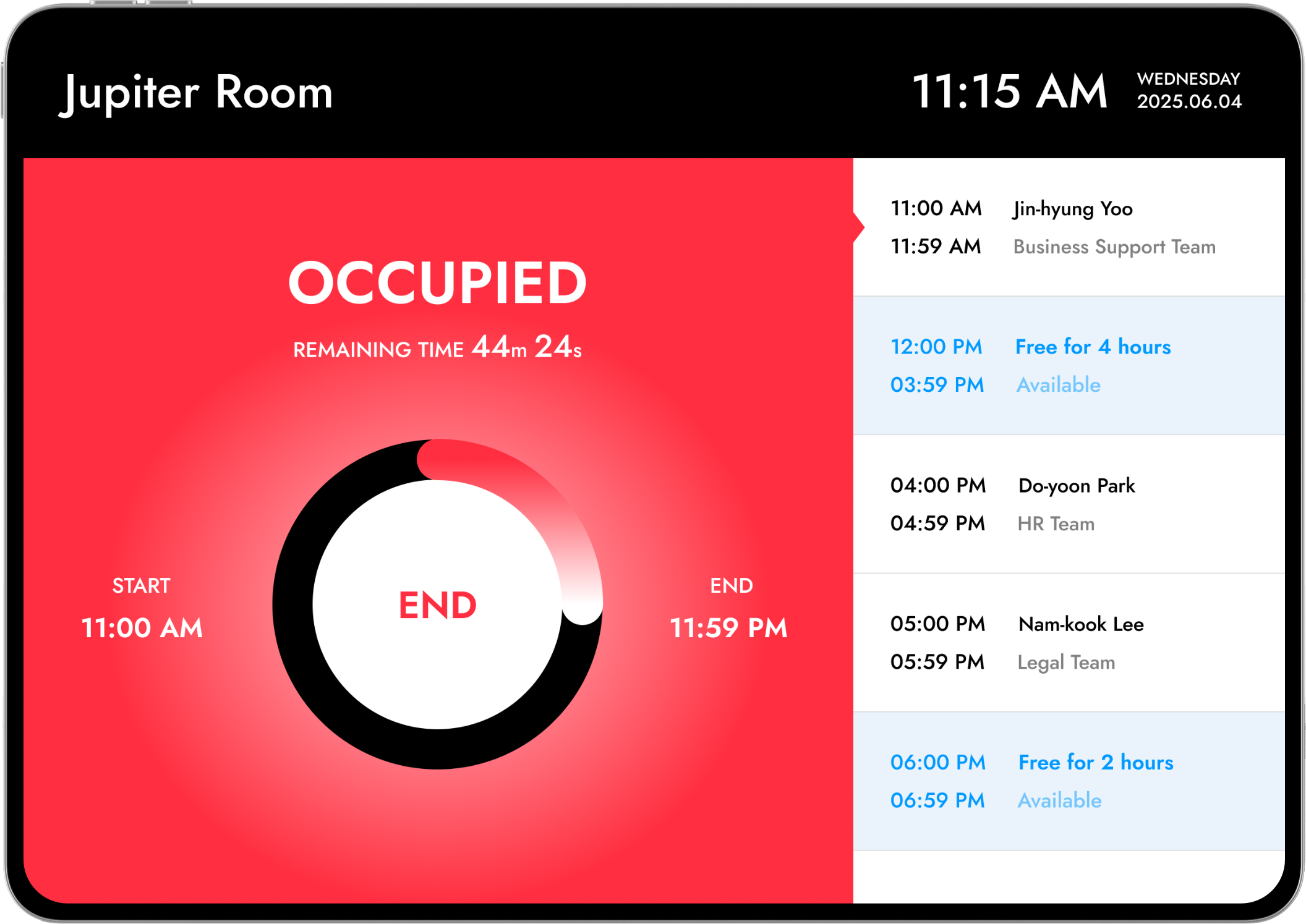 사용자가 회의실 사용 여부를 빠르게 인지하고, 즉각적인 행동으로 이어질 수 있도록 UX 흐름에 초점을 맞춰 설계되었습니다. Waiting, Occupied, Available의 상태를 컬러로 명확하게 구분하고, 중앙의 원형 타이머를 통해 남은 시간과 진행 상황을 직관적으로 파악할 수 있도록 했습니다.